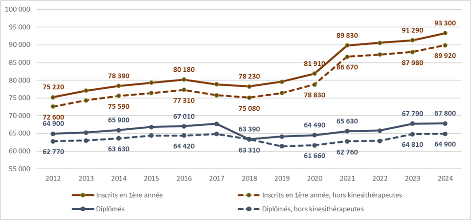 Graphique – Évolution du nombre d’inscrits en 1ère année et de diplômés en formation aux professions de santé non médicales et de sage-femme de 2012 à 2024.