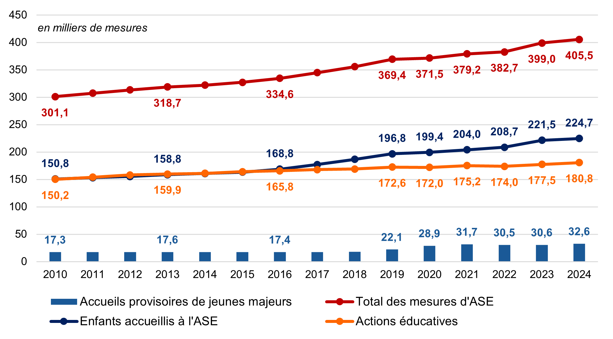 Graphique : Évolution du nombre de mesures d’aide sociale à l’enfance au 31 décembre, de 2010 à 2024
