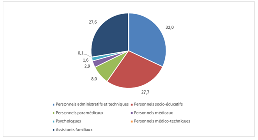 Le secteur de l’action sociale polyvalente regroupe 30 % des effectifs en équivalent temps plein (ETP). Le secteur de l’aide sociale à l’enfance (ASE) [hors assistants familiaux] en regroupe 21 %, et le secteur de la protection maternelle et infantile (PMI) 16 %. Le secteur des personnes âgées et handicapées et celui de l’insertion regroupent respectivement 13 % et 9,4 % de l’ensemble des effectifs de l’action sociale et médico-sociale départementale en ETP.