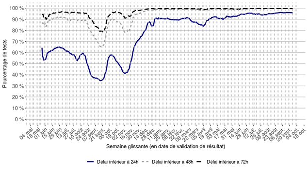 Lecture : 99,6 % des tests RT-PCR validés entre le 20 et le 26 septembre 2021 ont été prélevés dans les 72h précédentes.