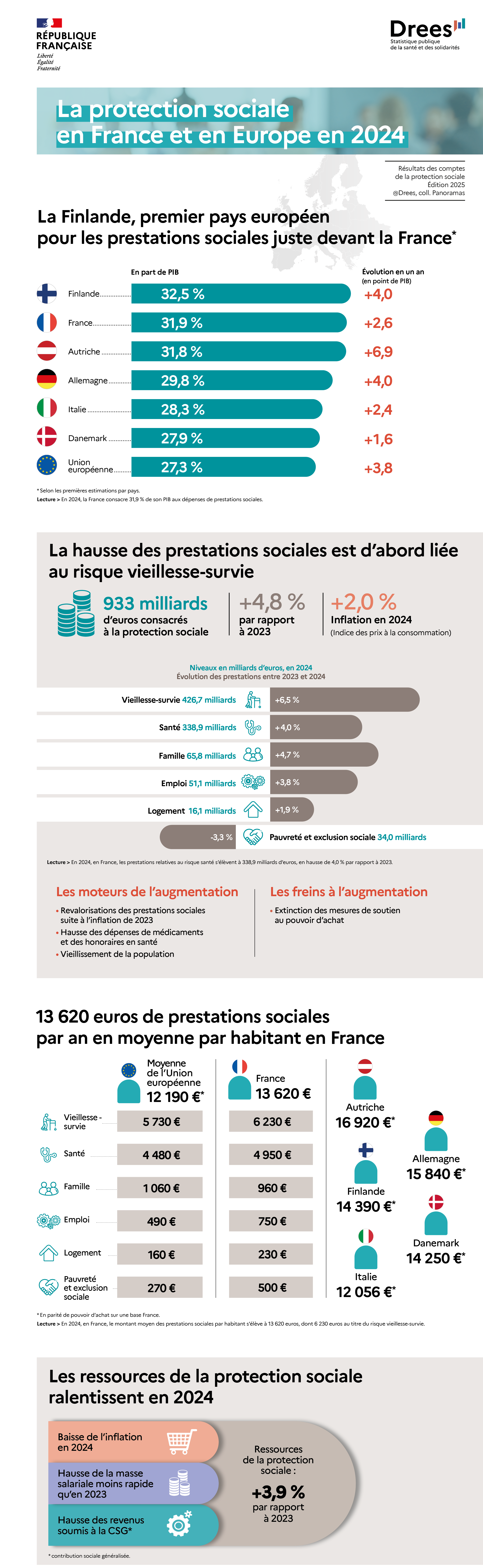 Lecture > En 2024, les prestations de protection sociale représentent 31,9 % du PIB en France et 27,3 % du PIB en moyenne dans l’Union européenne à 27.
