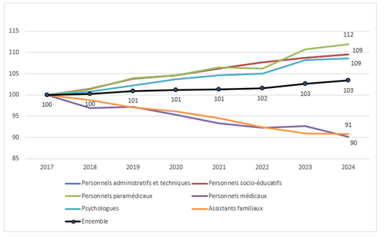 Lecture > L’année 2017 est l’année de base, fixée à 100. L'indice de 103 en 2024 signifie que l'effectif total de personnel départemental de l'action sociale et médico-sociale a augmenté de 3 % entre 2017 et 2024.
