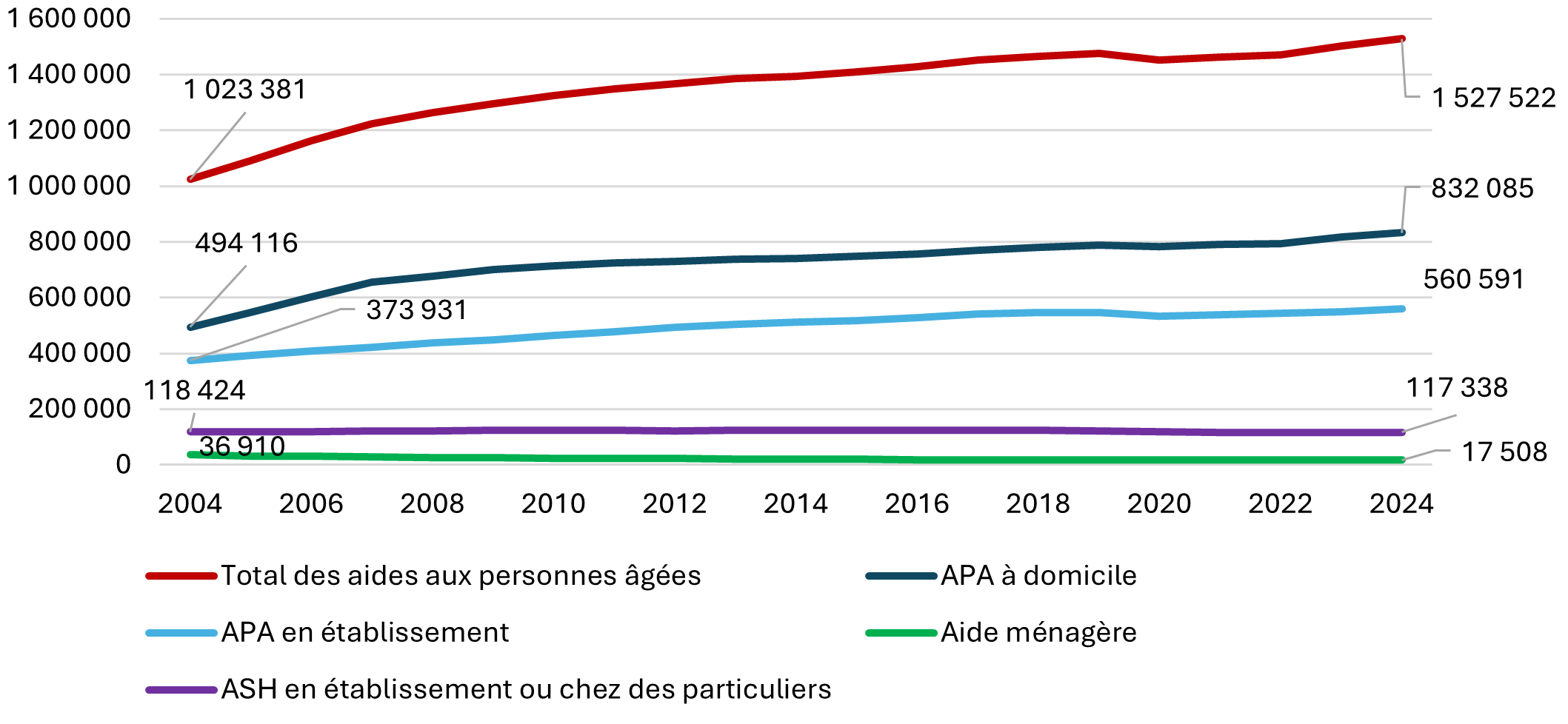 Fin 2024, 1,5 million d’aides sociales aux personnes âgées sont attribuées, par les départements, en France métropolitaine et dans les DROM, hors Mayotte (graphique 1), soit une augmentation de 1,7 % par rapport à 2023. L’allocation personnalisée d’autonomie (APA) à domicile en représente 54 %, l’APA en établissement, 37 %, et les aides sociales à l’hébergement (ASH) – en établissement ou chez des particuliers – 7,7 %. Le nombre de bénéficiaires de l’APA à domicile augmente de 1,7 % pour s’établir à 832 000 tandis que le nombre de bénéficiaires de l’APA en établissement progresse de 2,1 % pour s’établir à 561 000 fin 2024. En France, 9,2 % des personnes âgées de 65 ou plus sont bénéficiaires de l’APA et 53 % des personnes âgées de 90 ans et plus. Par ailleurs, 7 bénéficiaires de l’APA sur 10 sont des femmes.
