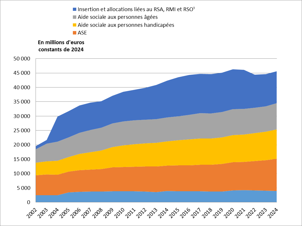 Graphique : les dépenses d’aides sociales des départements de 2002 à 2024