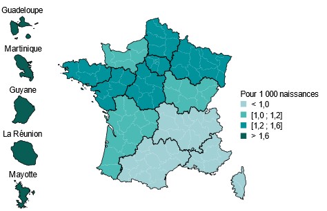 Considérant l’échelon régional, la feuille de route 2024-2030 Pédiatrie et Santé de l’enfant fixe comme objectif de parvenir dans chaque région à un lit de réanimation néonatale pour 1 000 naissances, d’ici à 2027 ; elle est supérieure à 1 lit pour 1 000 naissances dans quatorze régions, dont les cinq départements et régions d’outre-mer, et inférieure dans les quatre régions du quart sud-est de la France métropolitaine (carte).