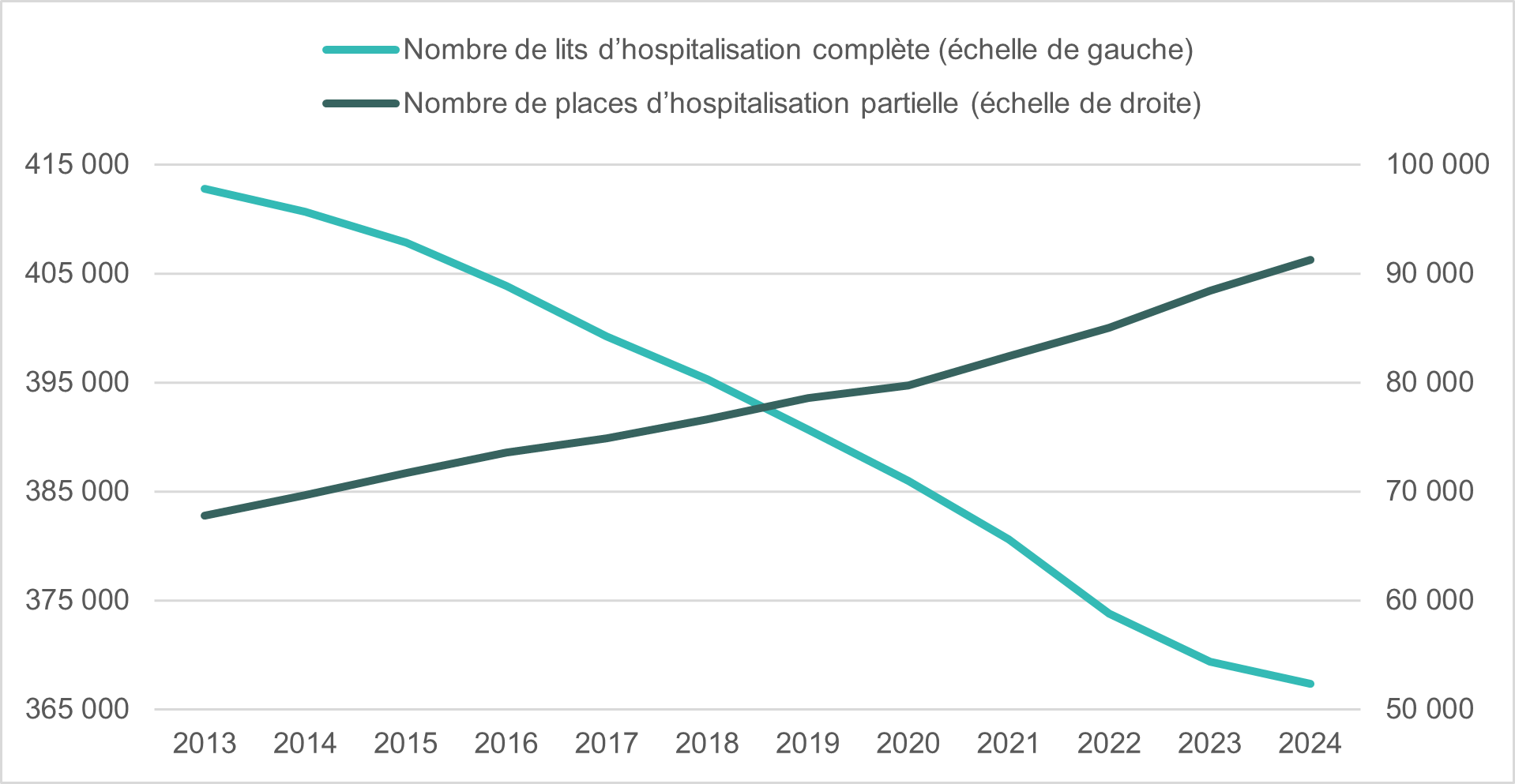 Depuis une vingtaine d’années, l’organisation de l’offre de soins évolue vers une hausse importante de la capacité de l’hospitalisation partielle (sans nuitée) et de l’hospitalisation à domicile, et en parallèle une diminution continue des capacités d’hospitalisation complète (lits). Des innovations en matière de technologies médicales et de traitements médicamenteux ont rendu possible ce « virage ambulatoire ».