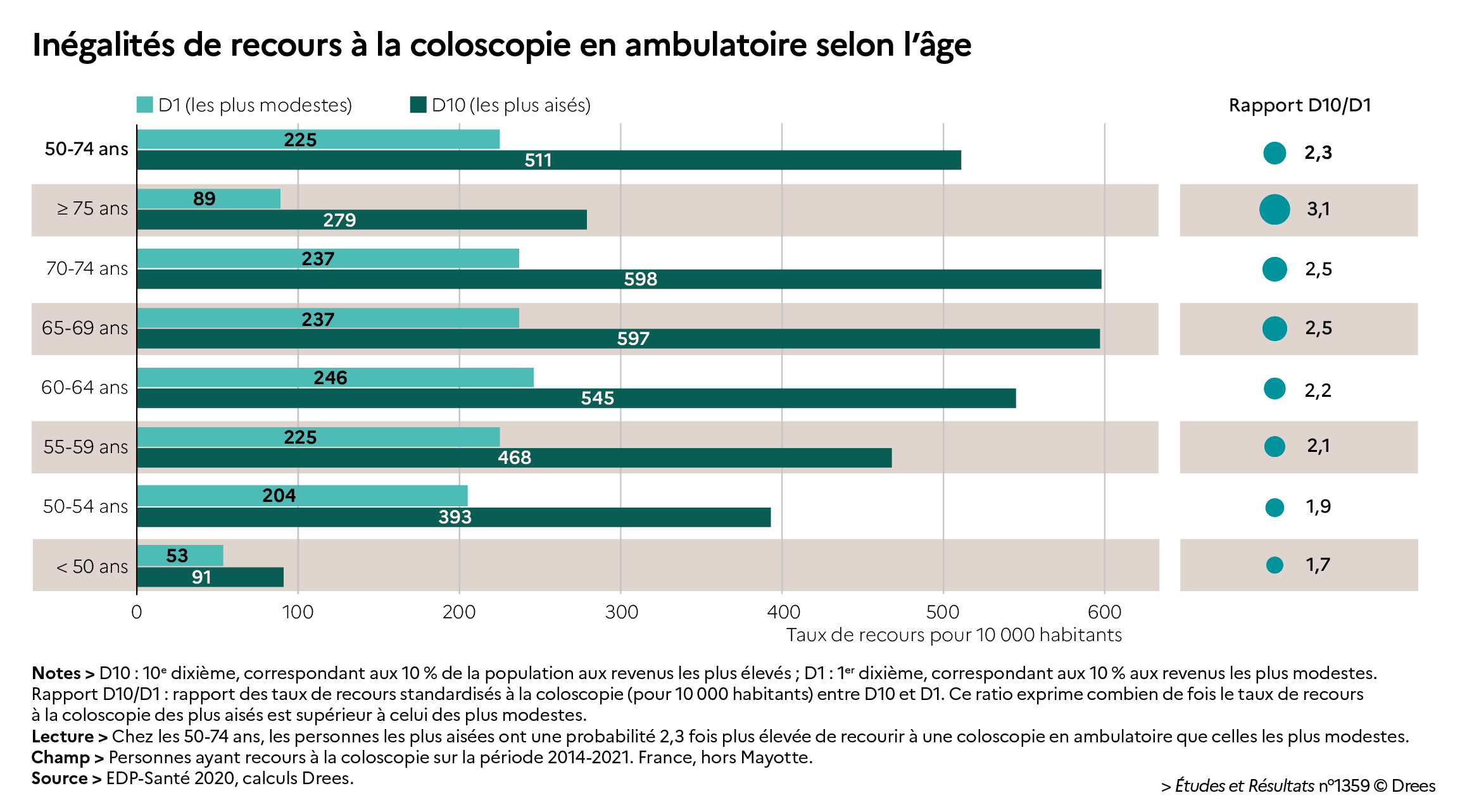 Le recours à l’endoscopie digestive est resté globalement stable depuis dix ans, hors période Covid-19. Cependant, les écarts de recours sont très importants selon le niveau de vie, en particulier pour les coloscopies programmées en ambulatoire, souvent réalisées dans un contexte de prévention ou de dépistage. Le taux de recours à la coloscopie est ainsi 1,6 plus élevé chez les 10 % les plus aisés de la population par rapport aux 10 % les plus modestes (256 personnes pour 10 000 habitants y ont eu recours chez les plus aisés contre 157 pour 10 000 chez les plus modestes, entre 2014 et 2021). Chez les 50-74 ans, principalement visés par le dépistage organisé du cancer colorectal, les plus aisés ont recours 2,3 fois plus souvent à une coloscopie ambulatoire.