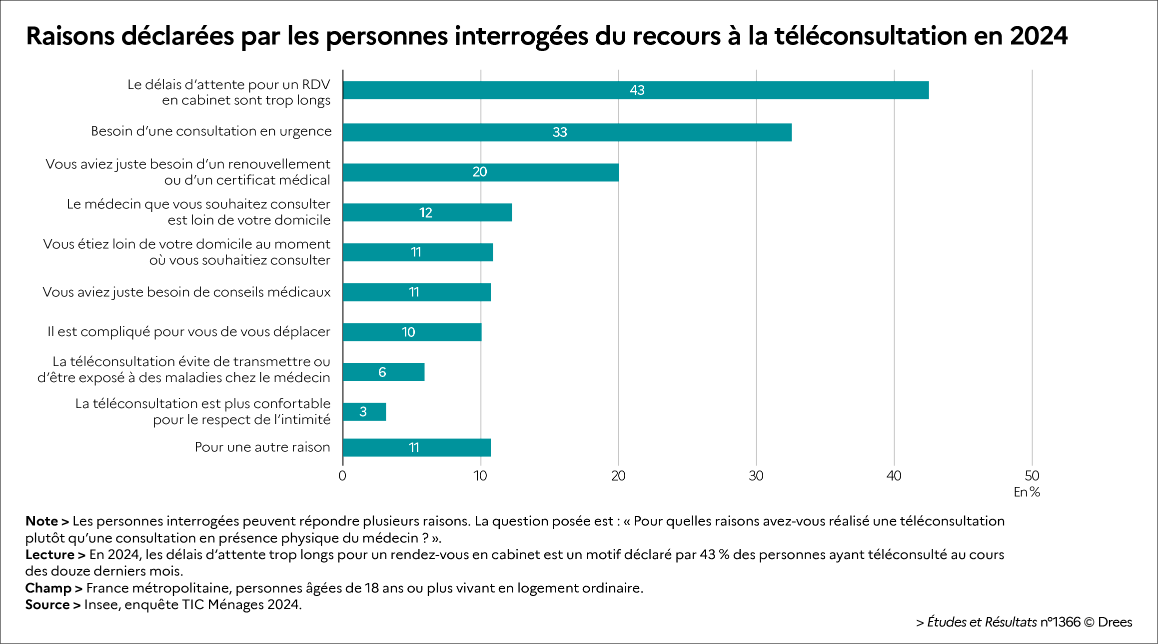 Les délais d’attente trop longs pour une consultation en cabinet sont la raison la plus souvent citée par les télépatients (43 % d’entre eux), suivie du besoin d’une consultation en urgence (33 %), et d’un renouvellement d’ordonnance ou d’un certificat médical (20 %) (graphique ci-dessous).