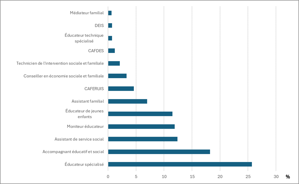À leur entrée en formation, 55 % des élèves et des étudiants avaient pour diplôme le plus élevé le baccalauréat ou un diplôme de niveau équivalent, et 29 % étaient titulaires d’un diplôme de niveau supérieur au baccalauréat. Cependant, ces résultats diffèrent selon les formations, en lien avec les niveaux exigés à l’entrée. À leur entrée en formation, 15 % des inscrits détenaient déjà un diplôme professionnel du secteur social. Pour 21 % d’entre eux, il s’agit du Diplôme d’État d’Éducateur Spécialisé (DEES), et pour 12 % du Diplôme d’État de Moniteur-Éducateur (DEME).