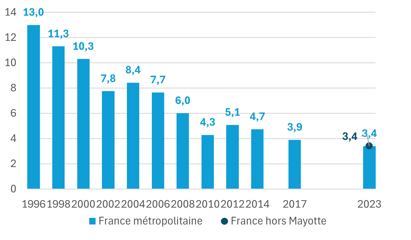 En 2023, l’absence de couverture par une complémentaire santé concerne 3,4 % de la population en France hors Mayotte. Si cette part s’est considérablement réduite depuis 25 ans, elle est relativement stable voire en légère baisse, depuis 2010 et demeure toujours plus élevée chez les plus modestes : 7 % des personnes vivant sous le seuil de pauvreté ne sont pas couvertes en 2023 (graphique).