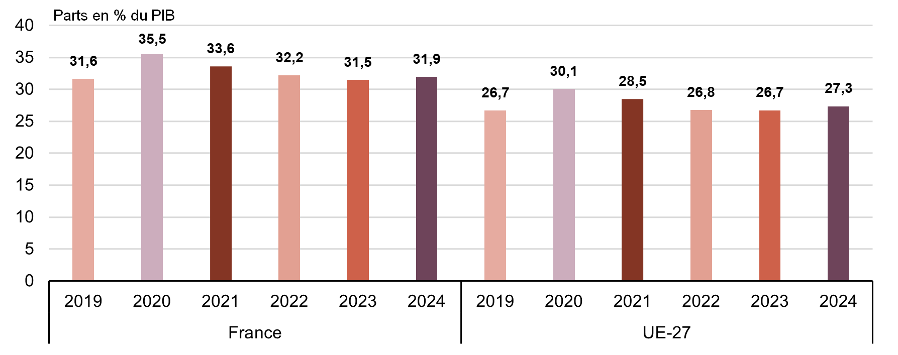 Lecture > En 2024, les prestations de protection sociale représentent 31,9 % du PIB en France et 27,3 % du PIB en moyenne dans l’Union européenne à 27.